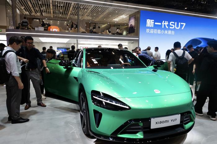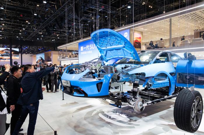 小米展台进行了小米SU7车型的拆解吊装展示。车身覆盖件、电池包、底盘结构、电子电气架构等核心零部件全部裸展。